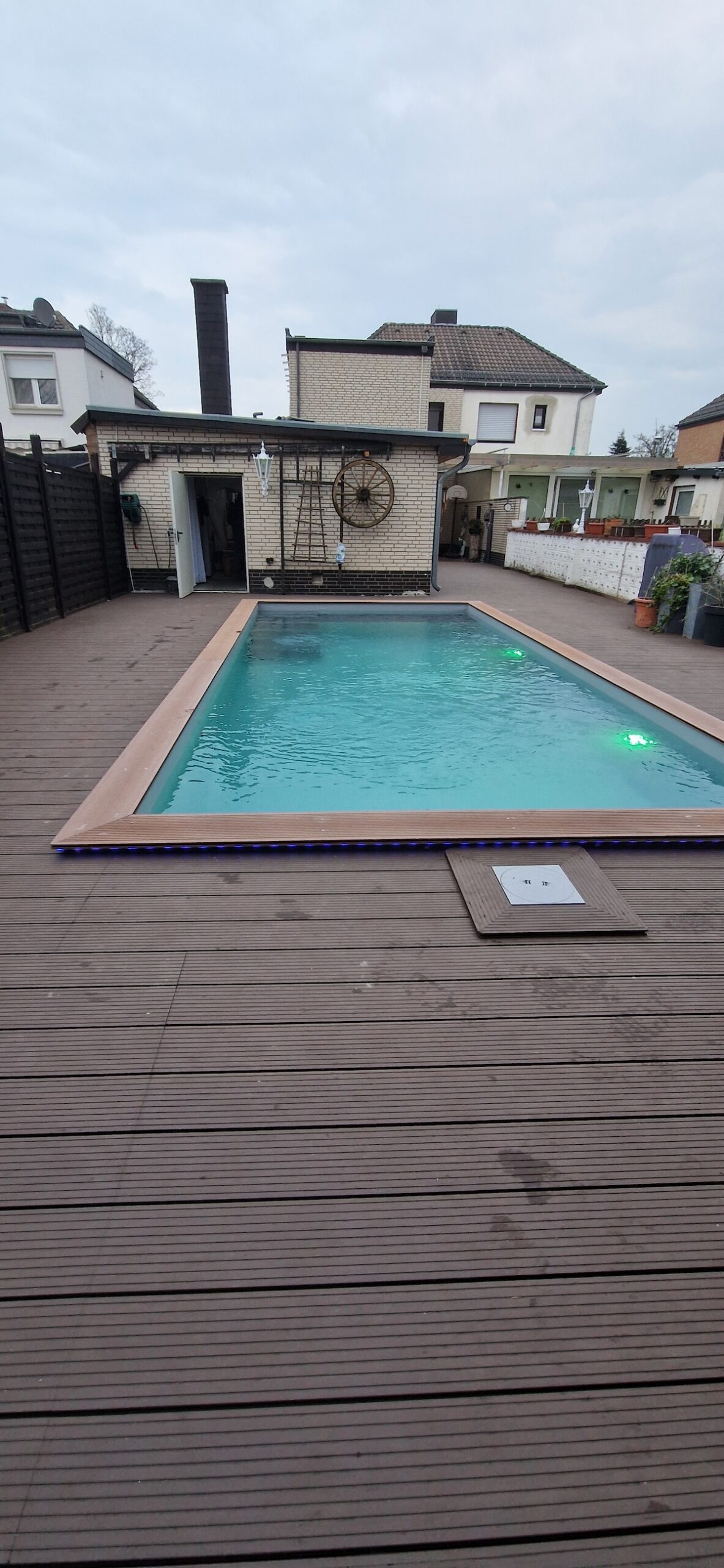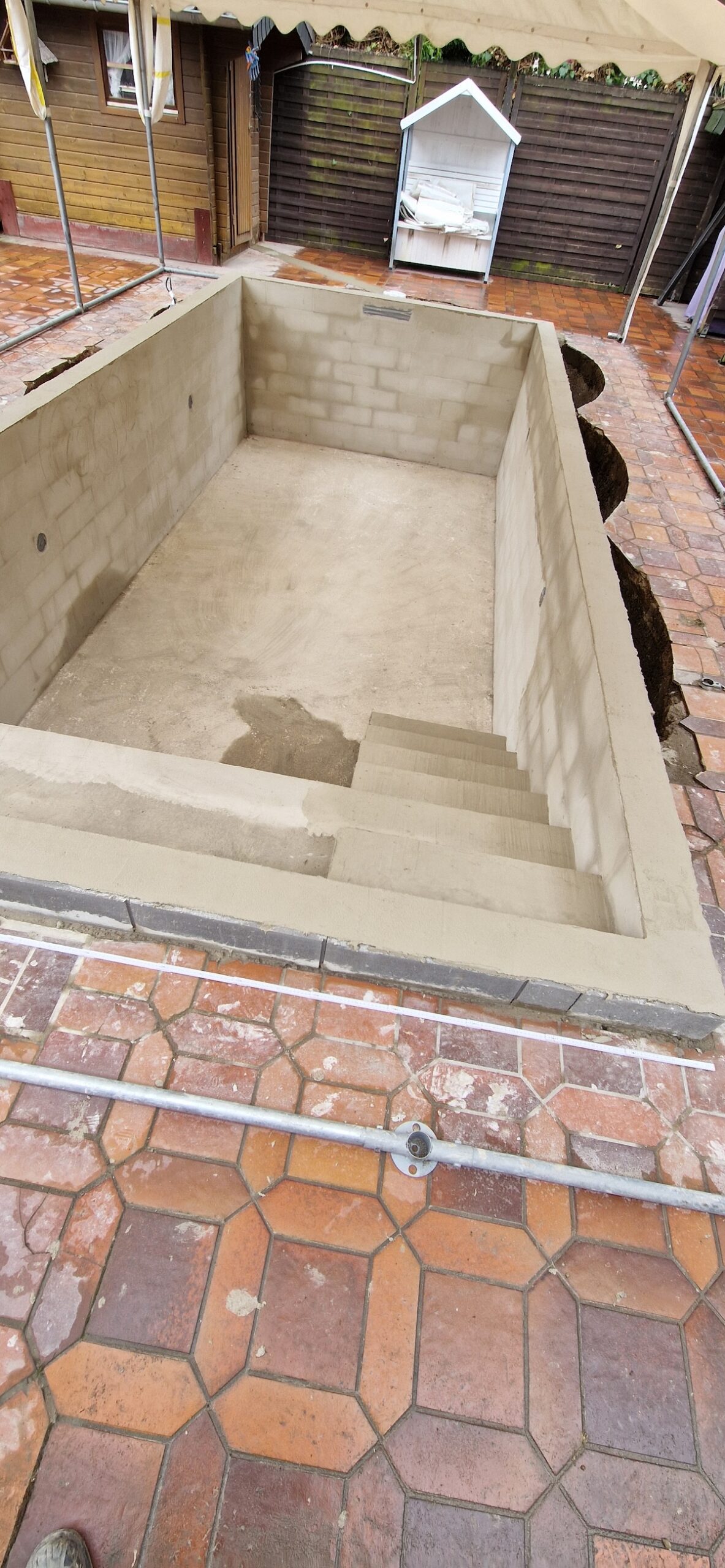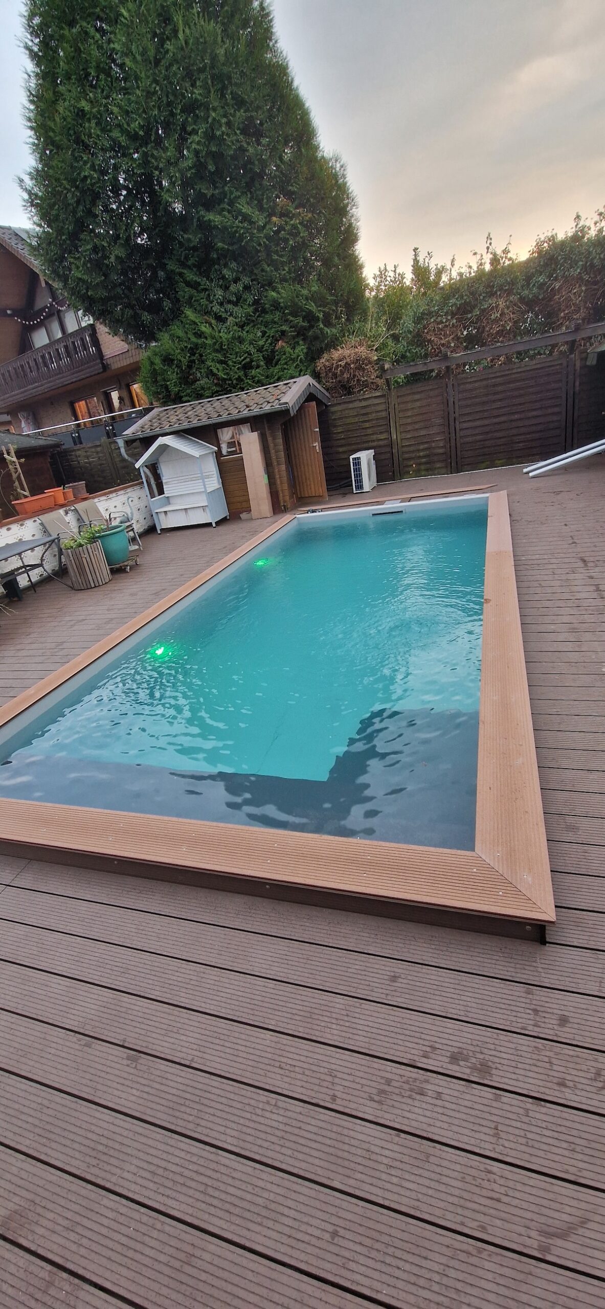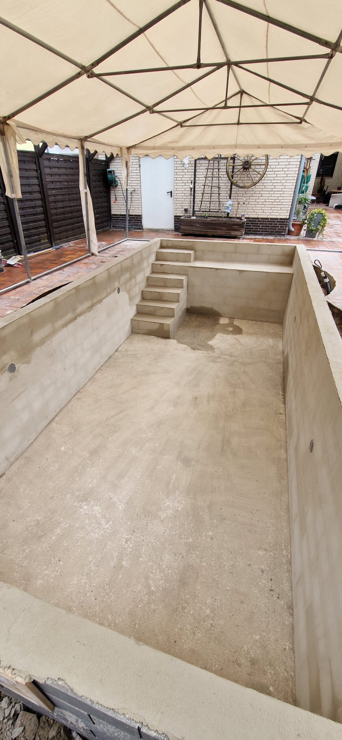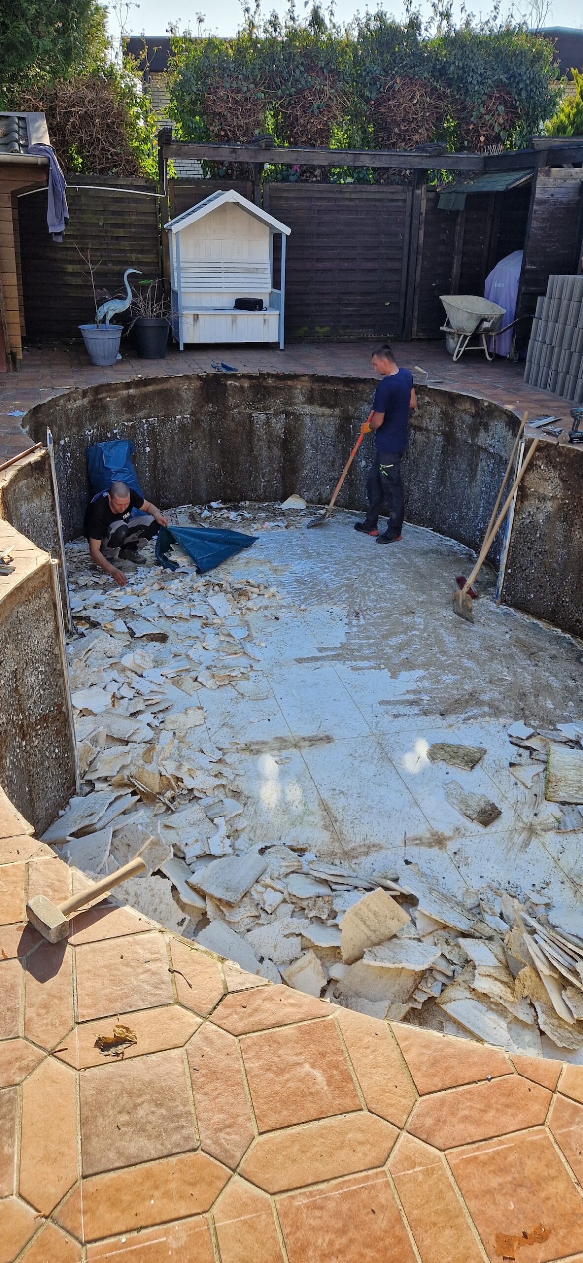 Aus einem alten, stark verschmutzten und jahrelang ungenutzten Pool wurde ein komplett neuer Gartenpool gemacht. Dafür wurde die alte Anlage inklusive Einbauteile, Leitungen und Technik vollständig zurückgebaut und fachgerecht entsorgt. Anschließend wurde der Untergrund neu vorbereitet, eine stabile Bodenplatte erstellt und der neue Pool wieder sauber eingesetzt bzw. aufgebaut und neu einbetoniert.
