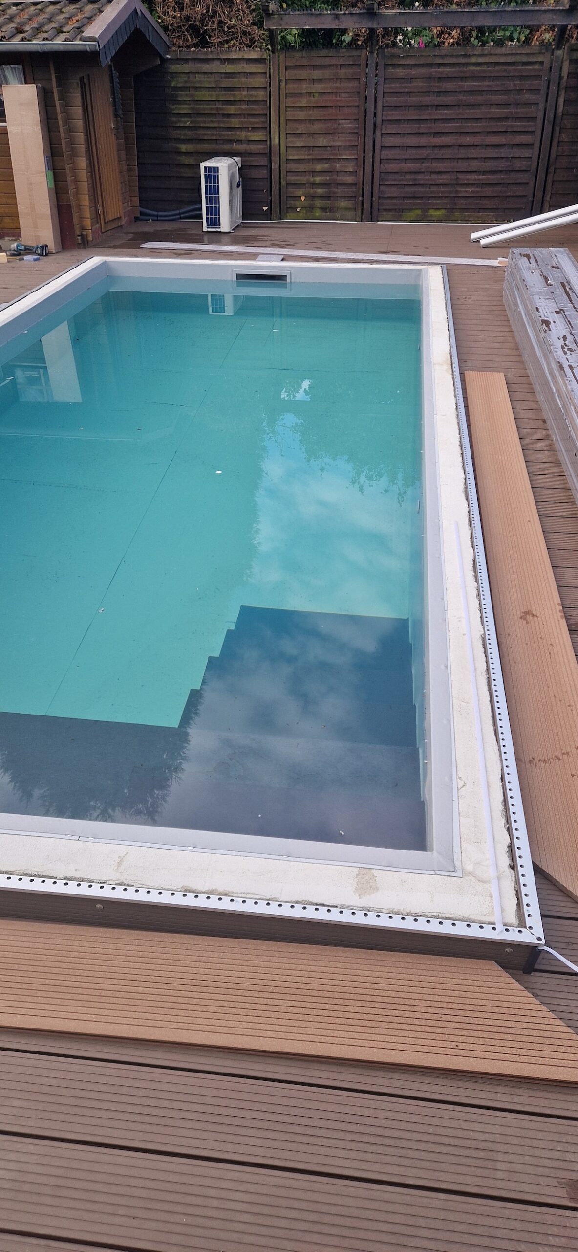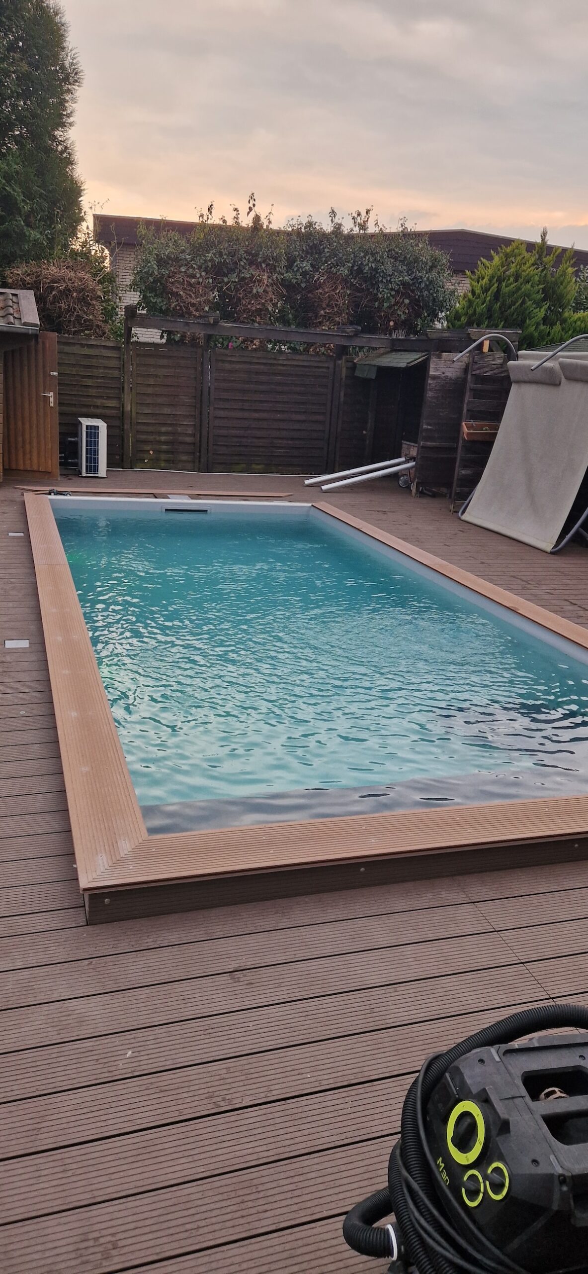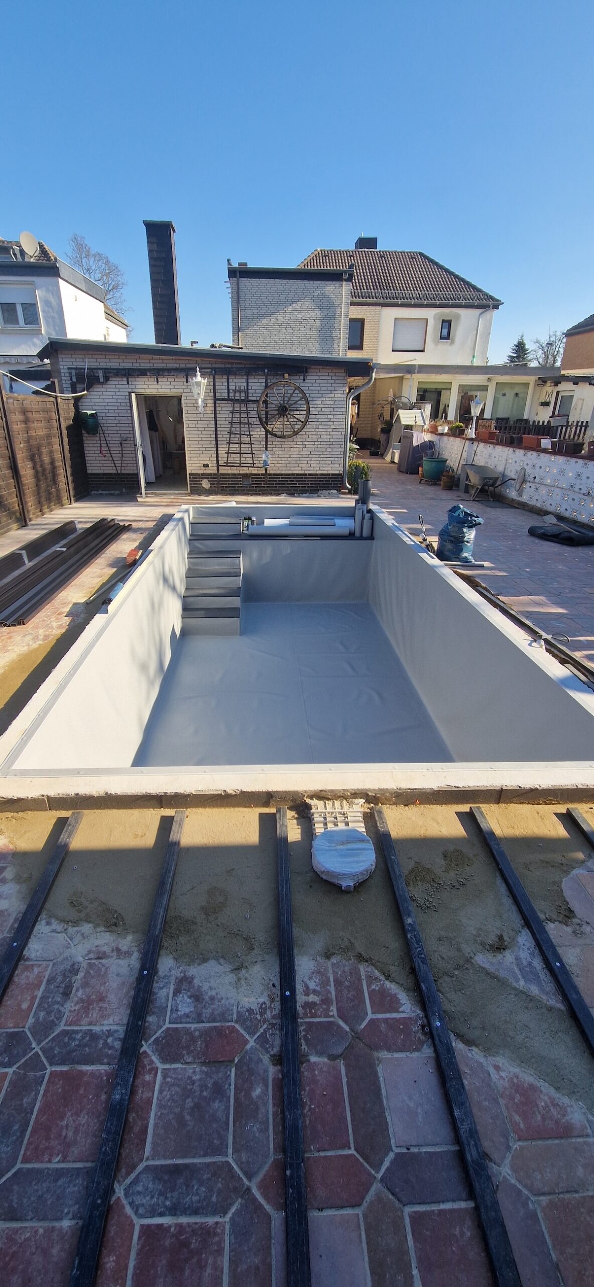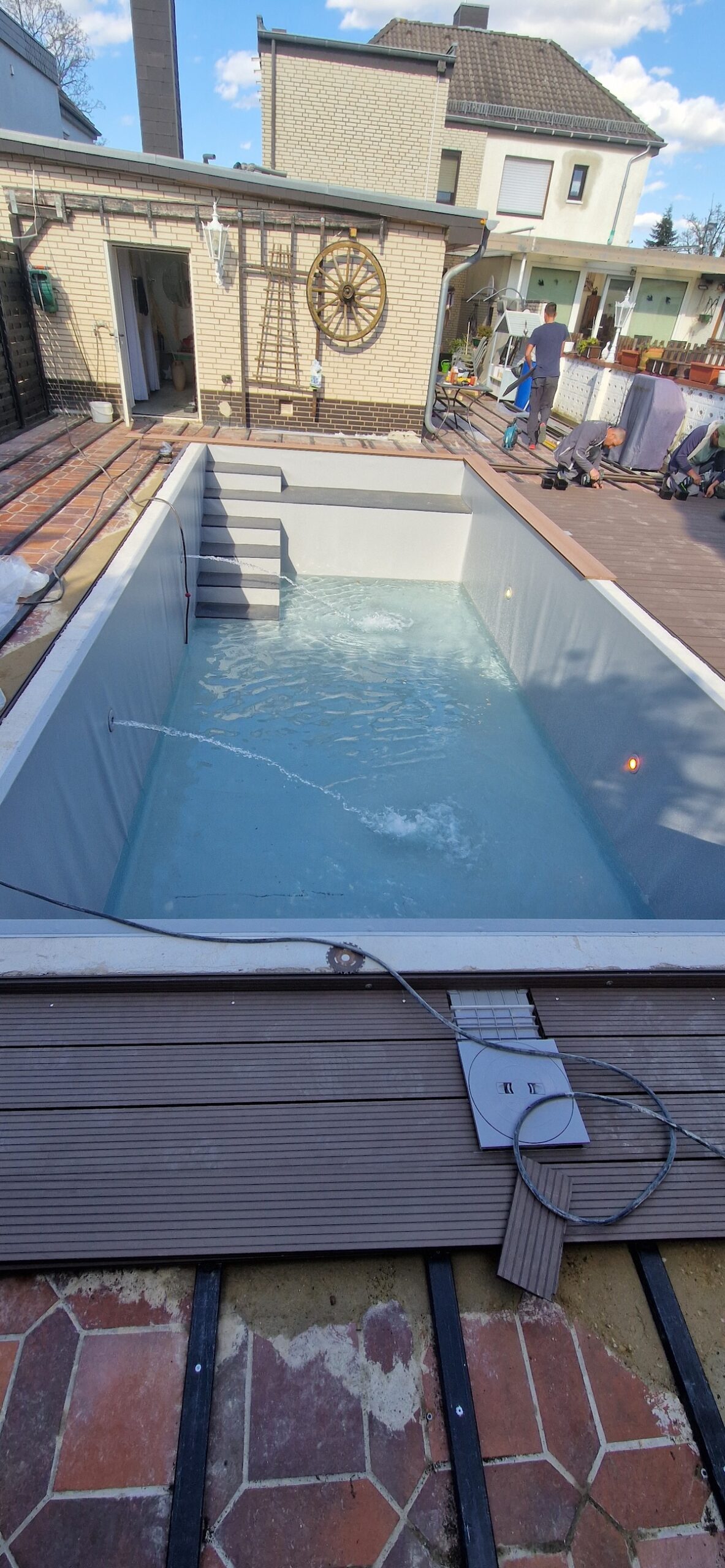 Danach wurden alle wichtigen Komponenten neu installiert: Verrohrung, Skimmer, Einlaufdüsen, Filteranlage und die komplette Technik – inklusive Dichtigkeitsprüfung und Inbetriebnahme. Zum Schluss wurde der Randbereich und die Umgebung wieder ansprechend hergestellt, sodass am Ende ein moderner, optisch hochwertiger und technisch zuverlässiger Pool entstanden ist, der perfekt in den Garten passt.