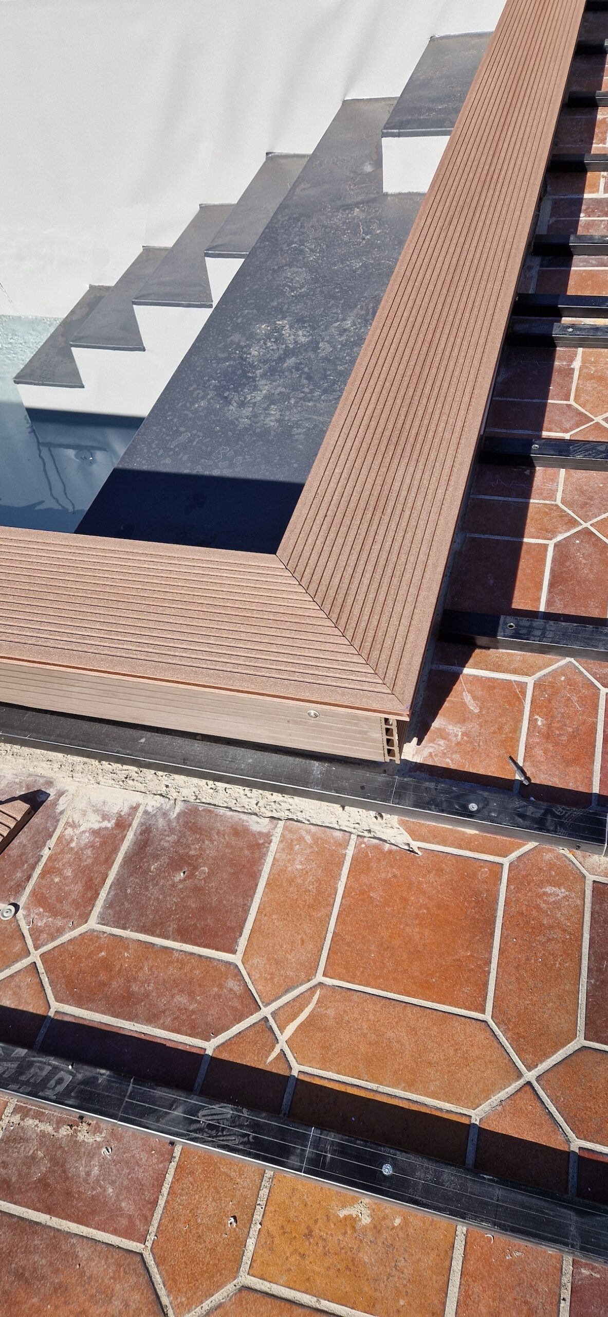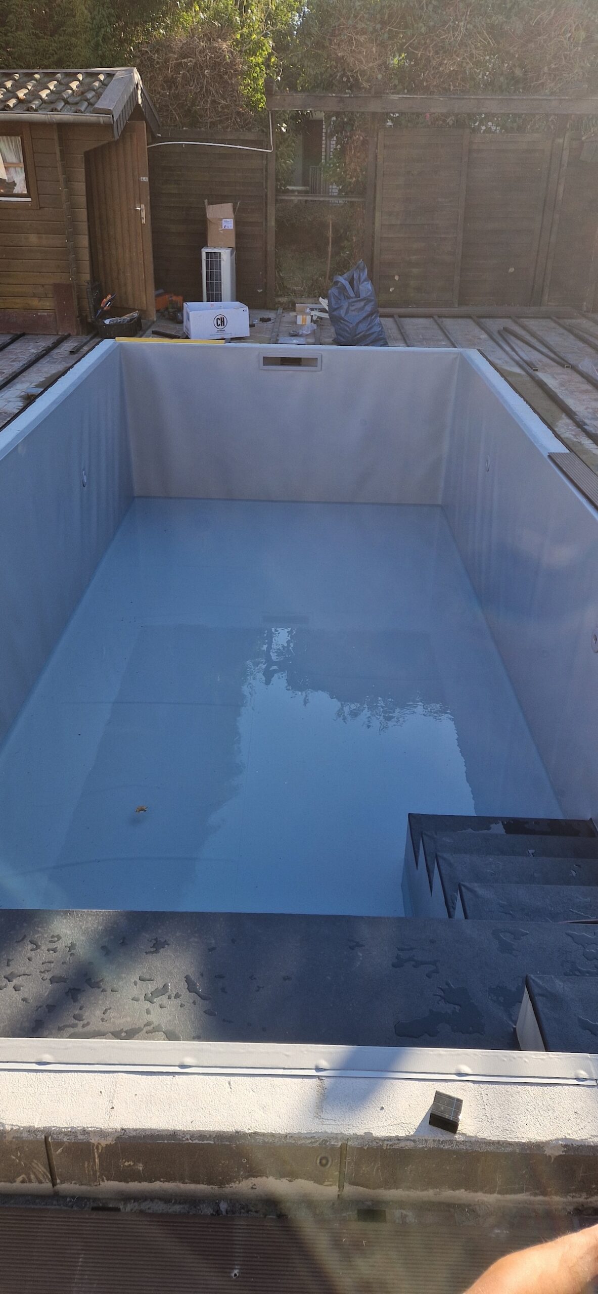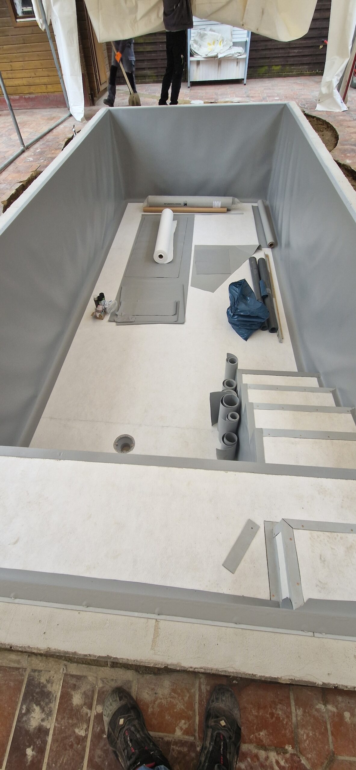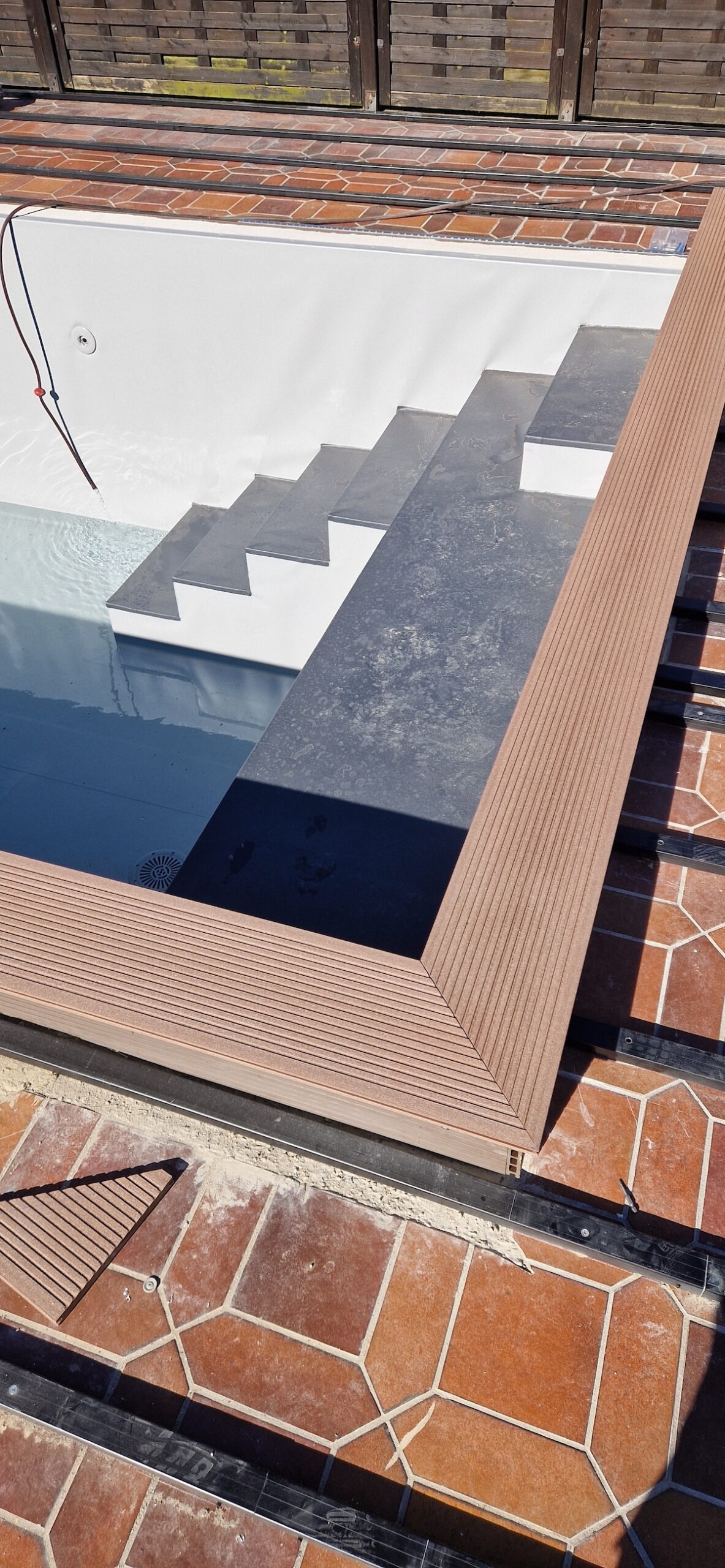 Danach wurden alle wichtigen Komponenten neu installiert: Verrohrung, Skimmer, Einlaufdüsen, Filteranlage und die komplette Technik – inklusive Dichtigkeitsprüfung und Inbetriebnahme. Zum Schluss wurde der Randbereich und die Umgebung wieder ansprechend hergestellt, sodass am Ende ein moderner, optisch hochwertiger und technisch zuverlässiger Pool entstanden ist, der perfekt in den Garten passt.